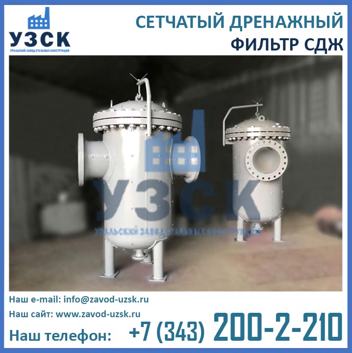 На формирование цены дренажного фильтра влияют следующие факторы: материальное исполнение, конструктивное исполнение, стоимость сырья в момент изготовления, комплектация, необходимость доставки в другой населенный пункт, срочность выполнения работ по изготовлению, прочие предпочтения заказчика. Уральский завод стальных конструкций изготавливает фильтры СДЖ-700 любого типового исполнения, а также нестандартные фильтры СДЖ 700 мм по чертежам заказчика или техническому заданию. Дополнительно к фильтрам СДЖ у нас Вы можете заказать сменные фильтрующие элементы любой тонкости фильтрации, ответные фланцы, прокладки и крепеж. По запросу изготавливаем также фильтры СДЖ-К-700 с концевым затвором. Для того чтобы узнать какова цена на фильтр СДЖ Ду700 в Актау с необходимыми Вам характеристиками, отправьте запрос в отдел продаж завода УЗСК по координатам, указанным в разделе «Контакты».